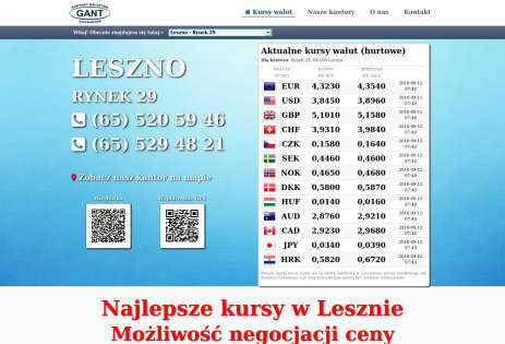 Spółka Kantory Gant prowadzi kilkanaście kantorów stacjonarnych, na których skupia swoją działalność. Kantor nie posiada rozbudowanego serwisu online, oferując jednak dokonywanie transakcji z wykorzystaniem rachunków bankowych.