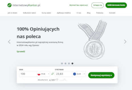 InternetowyKantor.pl to pierwszy kantor internetowy w Polsce. Jest to też jeden z największych serwisów wymiany walut w naszym kraju. Portal od startu w 2010 roku zgromadził ponad 350 tys. klientów i liczba ta stale rośnie. Kantor zyskał tak olbrzymią popularność, ponieważ oferuje bezpieczne i szybkie transakcje z wykorzystaniem atrakcyjnych kursów, jak również przelewy krajowe i zagraniczne.