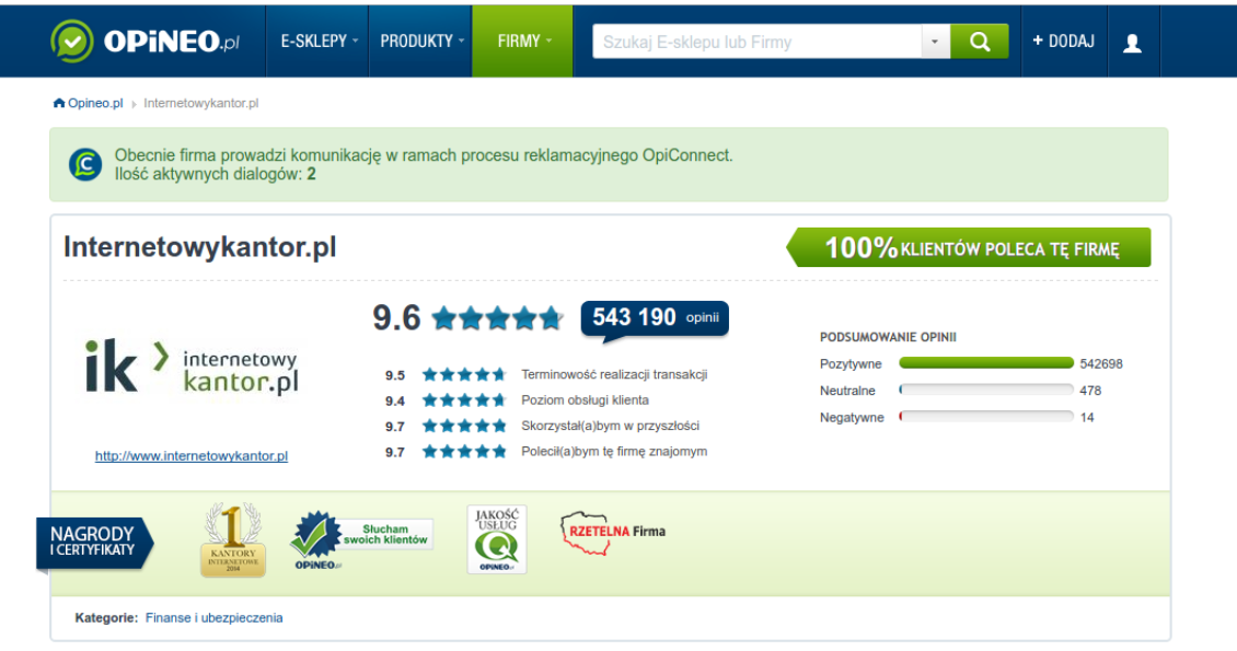 Wniosek: Zarówno w przypadku tych dużych jak i średnich kantorów w internecie dominują pozytywne opinie. Co ciekawe, w przypadku największych brandów, tj. InternetowyKantor negatywnych opinii prawie nie ma. Na opineo, czyli największym portalu weryfikującym opinie klientów, na ponad 500 tys. opinii, około 500 jest neutralna lub negatywna, to jest 1 promil.